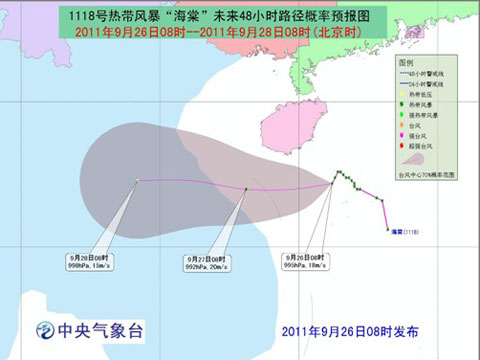 今年第18號熱帶風(fēng)暴“海棠”的中心9月26日09時(shí)位于海南三亞東南方約198公里的南海西部海面上,就是北緯17.0度、東經(jīng)111.1度,中心附近最大風(fēng)力有8級(18米/秒),中心最低氣壓為995百帕。