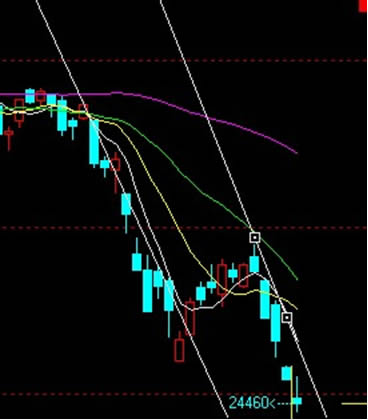 技術(shù)圖形來(lái)看, 上周行情是前幾周回調(diào)之前行情的延續(xù),市場(chǎng)重新回到快速下跌的通道,表現(xiàn)出與上波下跌(自34000點(diǎn)跌至26000點(diǎn))同樣的坡度,而且極有可能有對(duì)稱的跌幅。