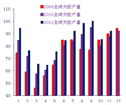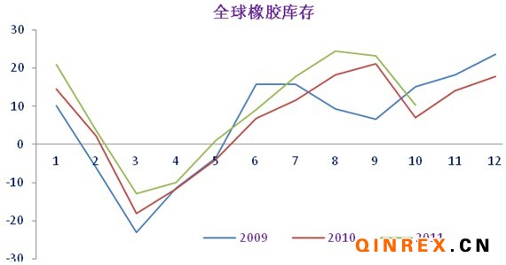 全球的汽車增長率遠低于天膠產量的增長率,另外全球超過10億輛的汽車保有量,使得輪胎的置換率對天膠的需求也形成較大的拉動,但從圖3中依然可以看出,2011年全球的天膠庫存量仍處在較高的位置,對市場的壓力不容小視。