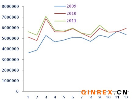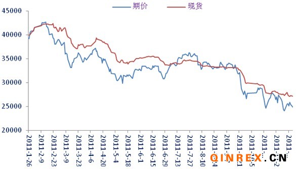 從8月上旬開始,國內橡膠庫存壓力開始增大,截止到10月份全國的民間庫存總計累計達到歷史高位,從圖5中可以看到今年中國的天膠庫存逐月走勢與2008年走勢相似,而2008年形成這種庫存上揚的主要原因是全球金融危機爆發,國內汽車行業以及輪胎企業的出口都受到重創,因此雖然08年的天膠進口量保持正常偏低水平,但依然形成了龐大的庫存。而回到2011年,形成這種快速上揚的庫存走勢的主要原因,在于今年國內貿易商一直受到高價位的膠價壓迫,價格稍有回落,迫不及待進口天膠補充庫存,8-10月份天膠進口量達到66萬噸,同比增長了30%,這也直接造成了目前國內的天膠壓力。因與08年的庫存壓力成因不同,因此近期天膠的走勢并未向08年同期一樣,出現一瀉千里的走勢,而是向下趨勢中苦苦掙扎,市場做多做空資金常常爭奪激烈。如11月9日,天膠期貨的持倉量達到33.2萬多手,創下中長期持倉量較大值的記錄,反映了空方擴倉打壓較重。而17日,滬膠指數又反彈至26030元/噸,持倉量拓展至30.3萬余手。截止到11月23日,縱觀11月份的16個交易日,天膠期貨有10個交易日稱為日內龍頭品種,其中六天跌幅居首,四日成為領漲龍頭。主要原因在于天膠做多資金基于中國季節性割膠淡季的來臨以及現貨價格相對于期貨價格的堅挺。