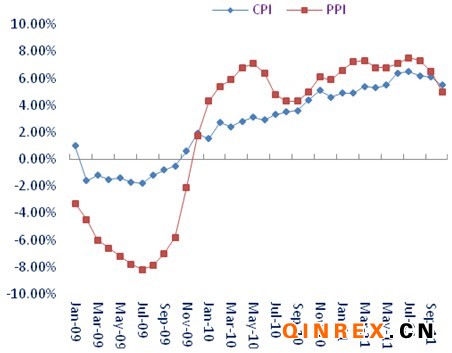 中國的實體經濟面臨國內外的壓力。國外方面:中國人民銀行21日公布的數據顯示,10月末中國外匯占款余額較9月末下降248.92億元。10月外匯占款出現負增長,與歐債危機持續深化、海外出現人民幣貶值預期及中國經濟增速下滑、房地產市場和資本市場萎靡等因素有關。而國內方面:2011年10月份,規模以上工業增加值同比實際增長13.2%,比9月份回落0.6個百分點。1-10月份,規模以上工業增加值同比增長14.1%,比1-9月份回落0.1個百分點。中國實體經濟面臨困境,但國內10月份的CPI和PPI雙雙回落,進入“5”階段。10月居民消費價格(CPI)同比漲5.5%,工業品出廠價格(PPI)同比漲5.0%。實體經濟減速明顯,而物價也出現回落,為政策轉向騰出空間。近期國家頻出微調政策。近期最新的信號就是浙江省農信系統部分機構獲準下調人民幣存款準備金,由原來的16.5%,下調到了16%,這個新標準在25號生效。毫無疑問現在政策正在轉向,緊縮政策已經見底了,開始向上走。而近期國家領導人的頻頻講話也顯示出之前將通脹放在首位的情況已經發生了很大變化。