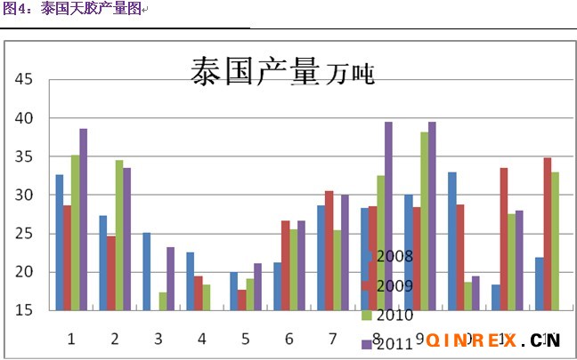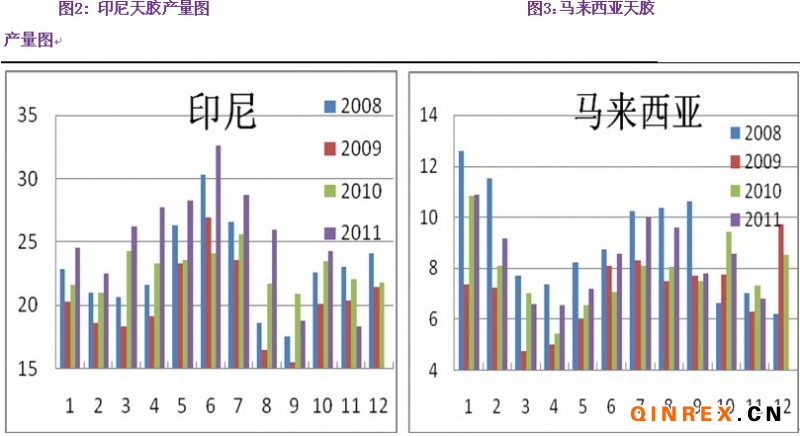 具體到天膠生產(chǎn)國,今年天膠產(chǎn)量的主要增長(zhǎng)點(diǎn)在印尼和馬來西亞上,印尼和馬來西亞的天膠產(chǎn)量占到全球天膠產(chǎn)量的43%,加之兩國的天膠生產(chǎn)以小手工業(yè)者模式為主。今年天膠價(jià)格高企,因此膠農(nóng)割膠積極性高,截止到2011年底,兩國的天膠產(chǎn)量同比增長(zhǎng)8%左右。