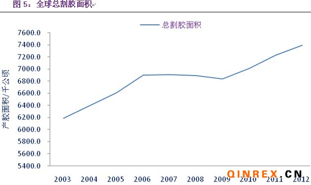 2003年以來,受到下游汽車銷量的拉動(dòng),天膠主產(chǎn)國開始大批重植膠樹,2010年以后,全球能夠開始割膠的膠林面積大增,2010年可開割面積增長(zhǎng)2.5%,2011年增長(zhǎng)3.1%,預(yù)計(jì)2012年將增長(zhǎng)2.2%至740萬公頃,加之膠價(jià)的高企激勵(lì)天膠割膠技術(shù)的進(jìn)步和割膠效率的提高,目前主要產(chǎn)膠國的天膠畝產(chǎn)量都得到一個(gè)較大的提升,2011年全球天膠產(chǎn)量同比增長(zhǎng)4.83%至1090.3萬噸。根據(jù)增加的割膠面積和提高的割膠率來看,2012年預(yù)計(jì)全球天膠的產(chǎn)量將增加7.8%至1175.3萬噸。另外全球還有300萬公頃的膠林等待開割。因此未來幾年內(nèi),天膠的供應(yīng)上應(yīng)是快速增長(zhǎng)的過程。
