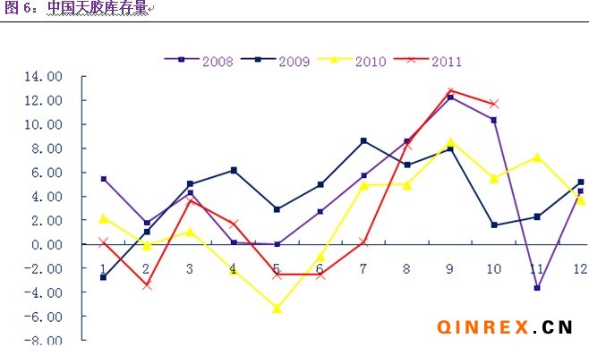 2011年由于下半年的盲目訂單,國內(nèi)大量進(jìn)口天膠,8—12月份天膠進(jìn)口量累計(jì)超過110萬噸,同比增長(zhǎng)28.12%,大量進(jìn)口量使得國內(nèi)飽受庫存壓力。主要原因是2009-2010年新進(jìn)入市場(chǎng)的中國買家,缺乏經(jīng)驗(yàn),預(yù)定大量訂單,即使在市場(chǎng)暴跌后出現(xiàn)違約,進(jìn)口量依然巨大,今年8-11月份,中國橡膠進(jìn)口量同比增長(zhǎng)近32%,但8-12月份的輪胎生產(chǎn)和汽車銷量表現(xiàn)萎靡,今年8-12月份輪胎產(chǎn)量同比增長(zhǎng)12.26%,汽車銷量同比僅增加了0.89%,橡膠進(jìn)口量的劇增和下游消費(fèi)量的小幅增加不匹配,導(dǎo)致國內(nèi)天膠庫存量龐大。截止到去年年底中青島保稅區(qū)最新的天膠庫存數(shù)據(jù)在20萬噸以上,而到2012年1月份天膠庫存更是達(dá)到25萬噸,處于歷史最高值。而據(jù)天然橡膠生產(chǎn)國聯(lián)盟估計(jì),截止到2011年年底,中國天膠的庫存將達(dá)到33.46萬噸,同比增長(zhǎng)6.56%;第二大天膠消費(fèi)國印度的庫存量將達(dá)到33.63萬噸,同比增長(zhǎng)6.8%。而中國的年消費(fèi)量大約是350.3萬噸,印度的年消費(fèi)量為95.5萬噸,中國的庫存消費(fèi)比接近10%,印度的庫存消費(fèi)比更高達(dá)35%。主要消費(fèi)國的天膠庫存量高企,壓制天膠價(jià)格上漲。