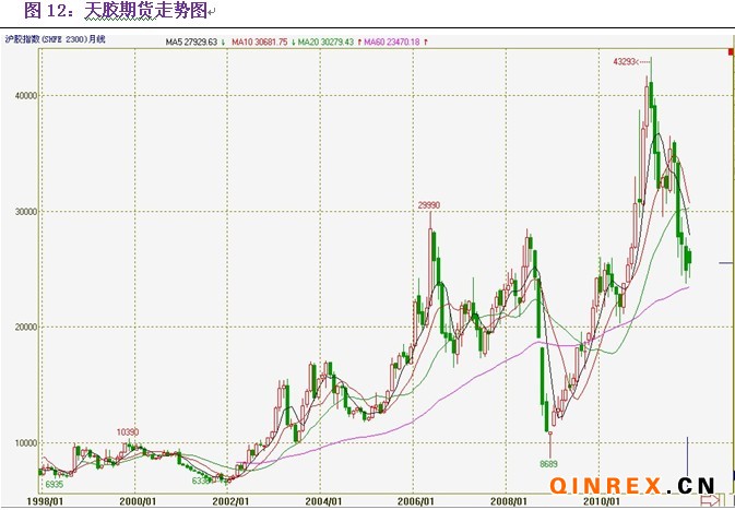 2011年2月1日天然橡膠期貨經(jīng)過兩年多的牛市,來到了歷史巔峰43000元/噸,正當(dāng)市場(chǎng)一篇?dú)g呼,等到天膠走向5萬元/噸的新時(shí)代之際,市場(chǎng)上攻4天失敗后陷入萬劫不復(fù)的下挫走勢(shì)。在全球岌岌可危的金融危機(jī)和天膠自身疲弱不堪的基本面的壓力下,天膠分3步下挫至23000元/噸,跌幅達(dá)到46%。經(jīng)過如此大幅的下挫,天膠是否已經(jīng)調(diào)整到位,我們通過對(duì)天膠基本面的解析認(rèn)為,2012年天膠自身的基本面并不樂觀,即使后期美國退出QE3,天膠由于自身基本面的拖累,也難再現(xiàn)歷史輝煌,2012年或?qū)⒃诨久婧秃暧^政策的反復(fù)下,形成強(qiáng)震走勢(shì)。