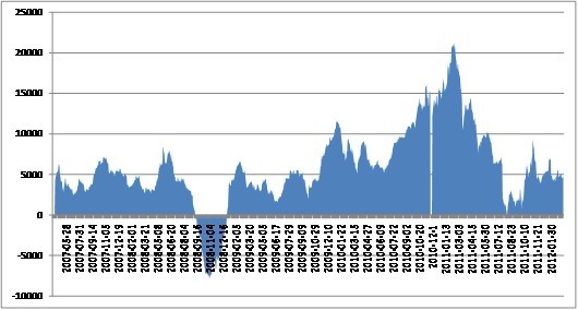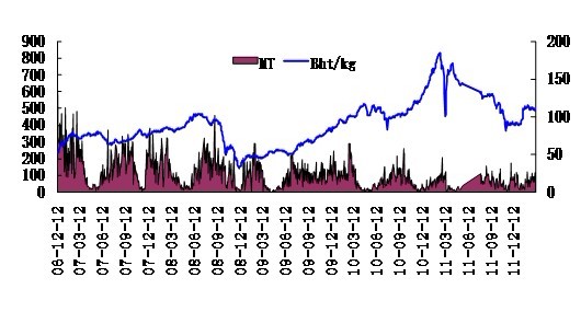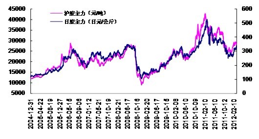 日膠:本周日膠維持震蕩行情,近期國際市場消息面偏多,希臘債權置換成功以及歐洲央行發放貸款打消了希臘近期違約的風險,雖然近期歐元區經濟數據依然不佳,但是歐債緊張氣氛得到緩解,美國經濟數據依然優異,最新就業以及相關經濟數據依然好于預期,顯示美國經濟增速加快,雖然伯南克在議息會議上的講話沒有提及QE3,市場對于美國QE3的期待下降導致美元升值,但是美股本周連續上漲的勢頭給大宗商品市場帶來動力,日膠本周受周圍環境利好帶動一度重回340日元上方,但是本周后半段滬膠弱勢拖累日膠走勢,市場依然沒能擺脫震蕩格局。截至周五,日膠合約1208收于332.6日元,較上周下跌2.8日元。
