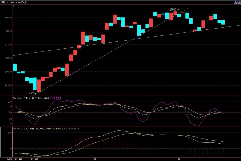 技術分析:本周天膠1205合約在28000—29500之間進行區間震蕩走勢,上半周滬膠延續上漲態勢,但是周三受到股市的影響沖高回落,后期表現為多頭強勢暫緩,隨著持倉減到20萬手,多空雙方力量均衡。但是當回調到28300時,受到下方支撐支撐,滬膠積蓄能量有可能再次上攻。從天膠1205日K線的走勢可以看出,自1月20日,從27000開始的震蕩上漲趨勢,得到上升支撐線2的支撐,即,本周28000價位上的支撐。