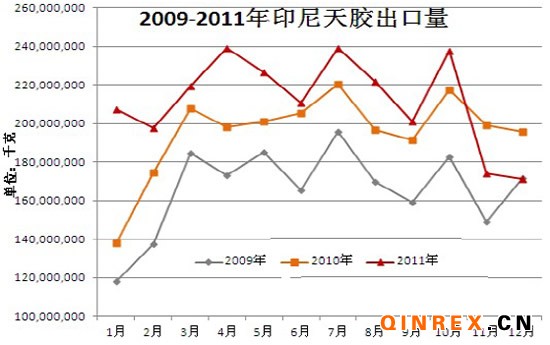 2011年,印尼天然橡膠產量264萬噸,同比增長2%;其中私人產量增加4萬噸,政府增加7600噸,莊園增加1600噸。