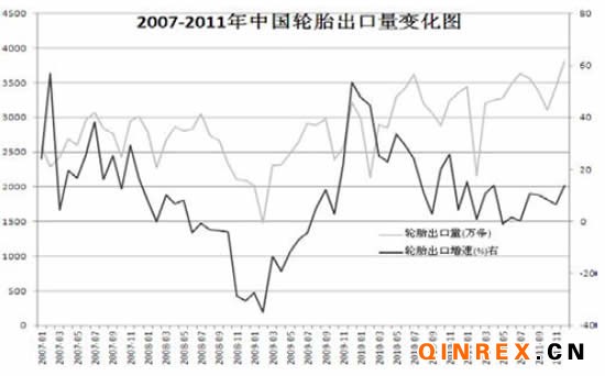 2011年中國出口輪胎39736萬條,同比增長7%。從產量、出口量的同比增速來看,2011年上半年出口同比增速要高于產量增速,而下半年則相反。