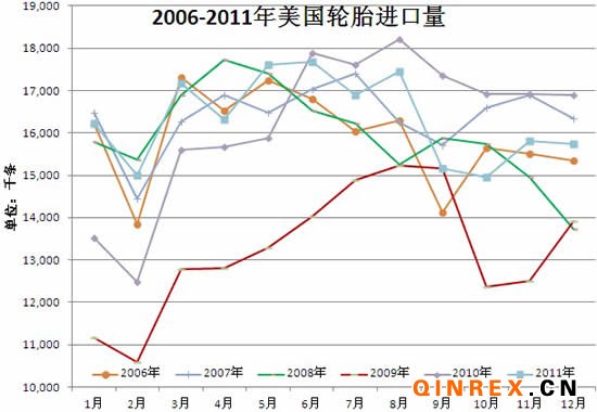 2011年,美國共進口輪胎196011千條,同比微增0.55%。從上圖可以看出進口量與2007年(2007年進口量為2000年以來最高)相差無幾。