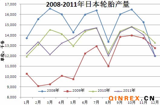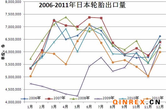 出口方面,由于美國市場進口減少,日本2011年輪胎出口同比下降5.2%至7千萬條。從上圖可以看出第四季度的表現甚至比金融危機以后的09年還要差。