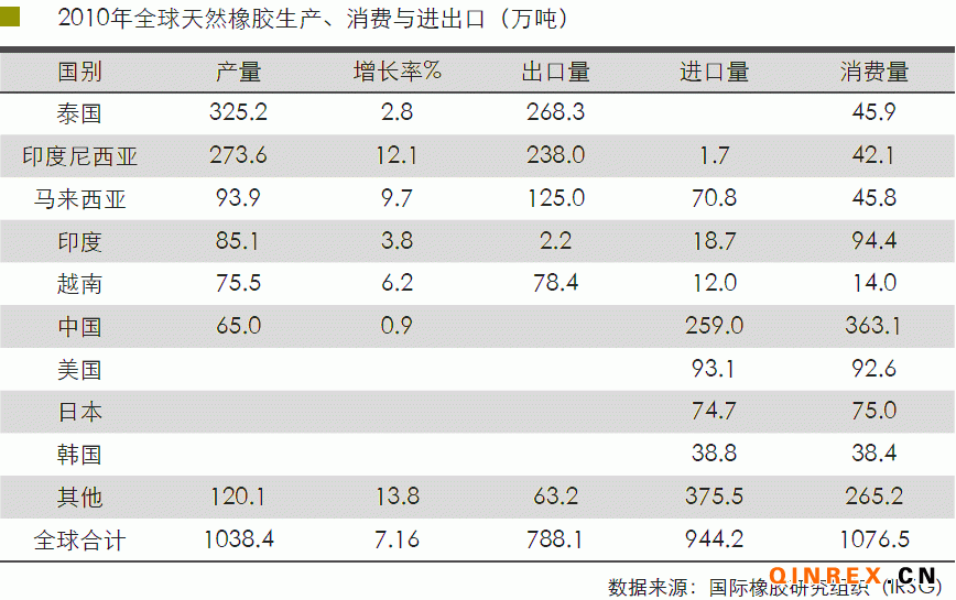 天然橡膠樹屬熱帶雨林喬木,種植地域基本分布于南北緯15度以內(nèi),主要集中在東南亞地區(qū),其種植面積約占世界天然橡膠種植面積的90%。主要生 產(chǎn)國 為泰國、印度尼西亞、馬來西亞、印度、越南、中國、緬甸、斯里蘭卡等,尤以 前三國為主,2010年前三國產(chǎn)量占世界總產(chǎn)量的66.7%,且其所產(chǎn)天然橡膠的絕 大部分用于出口。目前,泰國是全球天然橡膠產(chǎn)量和出口量最大的國家,2010 年出口量達268.3萬噸,占產(chǎn)量的82.5%。然而2010年泰國產(chǎn)量增速放緩,僅為2.8%。第二、第三產(chǎn)膠國印度尼西亞和馬來西亞的產(chǎn)量增速較快, 這主要受2010 年天然橡膠價格連創(chuàng)新高,提振了膠農(nóng)割膠的積極性以及馬來西亞東北部前幾年 擴種、膠林產(chǎn)量增加的影響。
