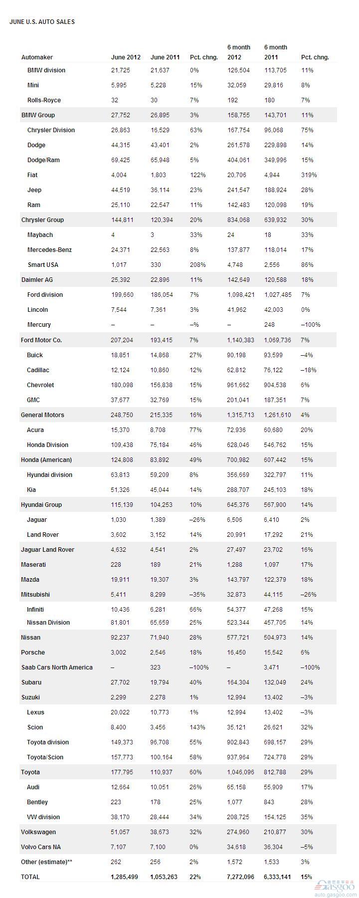 按照《華爾街日報(bào)》援引Motorintelligence.com的數(shù)據(jù),今年6月份,美國市場輕型車銷量為1,285,555輛,在去年6月份1,053,248輛的基礎(chǔ)上同比增長22.1%;今年上半年總銷量達(dá)到7,272,160輛,對比去年同期的6,332,566輛,同比增長14.8%。
