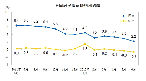 2012年6月份,全國居民消費(fèi)價格總水平同比上漲2.2%。其中,城市上漲2.2%,農(nóng)村上漲2.0%;食品價格上漲3.8%,非食品價格上漲1.4%;消費(fèi)品價格上漲2.3%,服務(wù)項(xiàng)目價格上漲1.9%。上半年,全國居民消費(fèi)價格總水平比去年同期上漲3.3%。