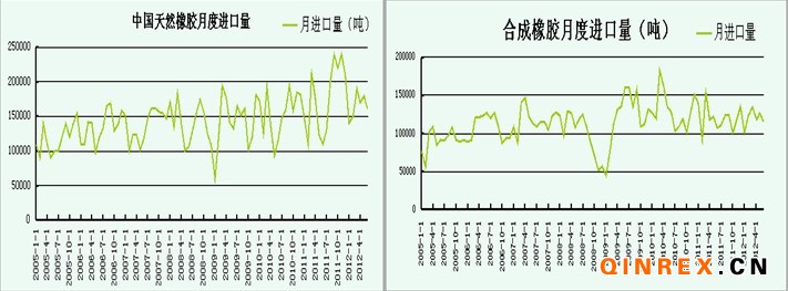 天然橡膠方面,2012年6月份我國天然橡膠進口量為16萬噸,1-6月為99萬噸。與去年同期相增加12.8%,6月份的天然橡膠進口量雖然增加,但是增速較5月份有所放緩。但橡膠的需求不佳,導致橡膠的銷售不理想,預計上半年進口的天然橡膠將再次增加國內整體的庫存量。