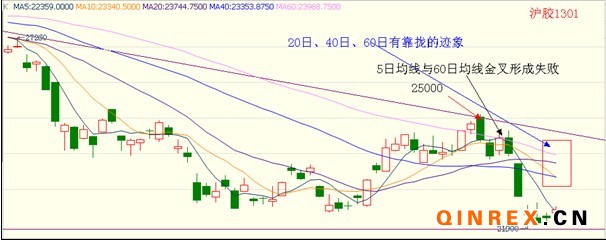 滬膠1301合約在25000處碰觸下行壓力線,轉頭向下,后面臨22000關口支撐,短期內維持低位振蕩走勢。技術看,5日均線與60日均線交叉失敗;但中長期均線20日、40日、60日均線有靠攏的跡象。24日之后的日K多為長影線,預計短期內受前期缺口22600-22900壓制,和22000關口的支撐。長期來看,中長期均線靠攏,后市將面臨著寬幅振蕩的態勢。建議滬膠1301合約在22000-23500區間交易。