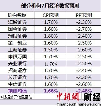 10家金融機構預測7月CPI同比漲幅均跌破2%,其預測均值為1.66%