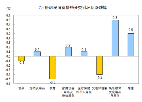 7月份,非食品價格環比上漲0.2%。其中,娛樂教育文化用品及服務、居住、家庭設備用品及維修服務、煙酒及用品、醫療保健和個人用品價格分別上漲0.8%、0.5%、0.2%、0.1%和0.1%,衣著、交通和通信價格分別下降0.5%和0.4%。娛樂教育文化用品及服務中,旅游價格上漲5.0%。居住中,水、電、燃料價格上漲1.4%。