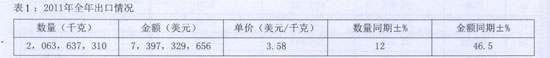 從表1可以看出,2011年國內(nèi)卡客車胎的累計出口量約為206噸,同比增長12%;出口金額共約74億美元,全年平均出口單價為3.58美元/千克,比上年的2.74美元/千克增加30%。