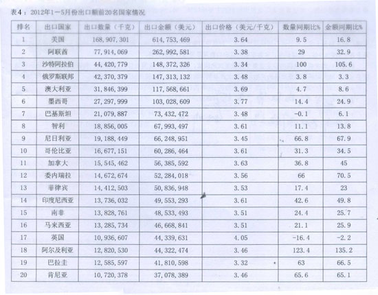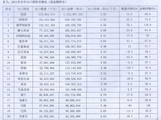 表3內(nèi)容顯示,美國是中國卡客車胎的第一大出口國。2011年,中國出口到該國的卡客車胎總量為37.83萬噸,同比增長12.8%,占國內(nèi)同類車胎總出口量的18%;第二大出口國是阿聯(lián)酋,出口總量為18.46萬噸(2010年是13.6萬噸),占總出口量的9%。前五大出口國分別為美國、阿聯(lián)酋、俄羅斯、澳大利亞和沙特阿拉伯,合計約占中國卡客車胎總出口量的40%。