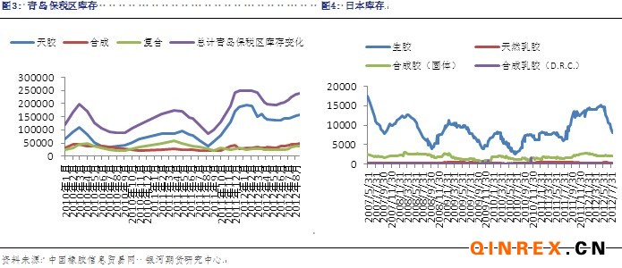 青島保稅區庫存仍然居高不下, 截止8月16日公布的庫存達24萬噸,上周庫存繼續增加,入庫壓力仍在,估計上周的庫存在24.2萬噸。然而日本的天膠膠庫存卻在穩步減少,截止8月10日, 庫存減少至7993噸,為2011年8月10日止的10日內6458噸以來的最低位。