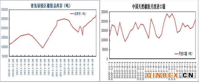 供給方面,10月份印馬泰三國政府開始按照既定的計劃削減出口,而8月橡膠的進口增加,青島保稅區(qū)庫存再次上行,同時國內主產區(qū)海南和云南目前處于割膠的旺季,預計新上市的橡膠將沖擊現(xiàn)貨價格。