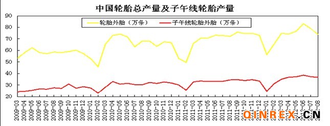 中國8月份輪胎產量為73.62萬條,其中子午線輪胎產量為36.66萬條,較今年7月減少0.52萬條,著主要是輪胎企業(yè)的開工率較低所導致。特保案的到期,以及目前輪胎生產成本較低,輪胎企業(yè)仍有增加負荷的可能,因此9月份輪胎的產量事項正向增加的概率比較大,10月份將延續(xù)9月份的增長勢頭。