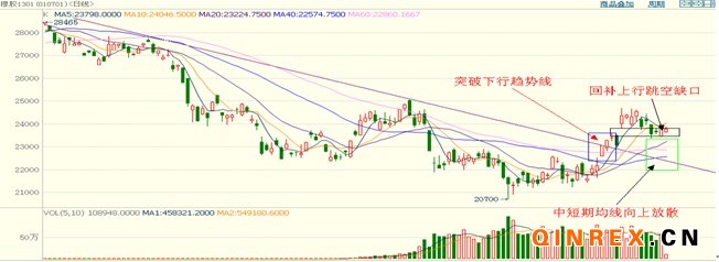 滬膠1301合約以大陽線突破下行趨勢線后,并以跳漲的方式繼續(xù)突破上行。期價短期回補跳空缺口,5日、10日均線形成死叉,短期走勢面臨著振蕩跳幀態(tài)勢。中長期均線開始向上發(fā)散,預計期價有望突破短期的整理平臺,轉而振蕩上行,但25000一線的壓力較大,期價將承壓下行。因此,10月份滬膠1301的整體走勢為沖高回落,運行區(qū)間為23000--25000。