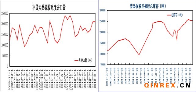 截至10月20號青島保稅區(qū)橡膠總庫存25.3萬噸,較上周的25.39萬噸基本持平。總共約20.8萬噸左右,其中煙片1.6萬噸左右,標膠15.4萬噸,復合膠3.9萬噸.,合成橡膠4.5萬噸。各大倉庫如陸海、中外運、山海通等庫存仍呈爆滿狀態(tài),而其他倉庫如得邦、乾通源、怡坤等雖有所緩解,但目前仍然呈出庫多少騰出庫位再入庫多少的格局。目前保稅區(qū)庫存滿庫容的格局仍將持續(xù)。