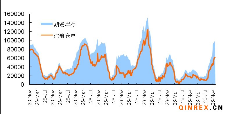 交易所庫存增加583噸為98280噸,注冊倉單增加1010噸為61920噸。