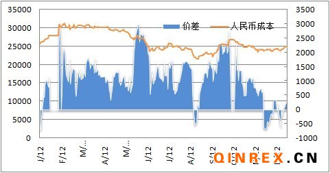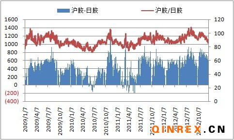 近期滬日比較有所下行,隨著日膠的不斷走高,二者美金折算價價差也有所收斂。不過鑒于日元近期貶值趨勢明顯,預計日膠將繼續維持較強走勢。