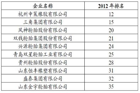 2012年度世界輪胎75強(qiáng)中國(guó)大陸企業(yè)排名情況