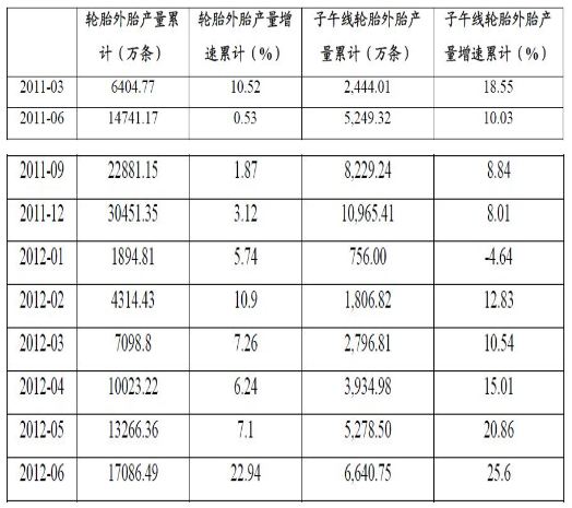 進(jìn)入2012年2季度,國(guó)內(nèi)汽車市場(chǎng)行情逐步回暖,產(chǎn)銷企穩(wěn)回升。1~6月,我國(guó)累計(jì)汽車產(chǎn)量952.92萬輛,同比增長(zhǎng)4.08%;實(shí)現(xiàn)銷量959.82萬輛,同比增長(zhǎng)2.93%。需求拉動(dòng)下,輪胎市場(chǎng)表現(xiàn)出較為強(qiáng)勁的復(fù)蘇態(tài)勢(shì)。1-6月,山東省輪胎外胎產(chǎn)量累計(jì)為17,086.49萬條,同比增長(zhǎng)22.94%,增速較上季度提高16.7個(gè)百分點(diǎn),且高于去年同期21.41個(gè)百分點(diǎn)。其中,子午線輪胎外胎產(chǎn)量累計(jì)為6,640.75萬條,同比增長(zhǎng)25.6%,增速較上季度提高15.06個(gè)百分點(diǎn),且高于去年同期15.57個(gè)百分點(diǎn)。