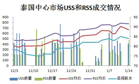 1月14日泰國五大中心市場USS成交407.49噸,均價88.56銖,較上周五跌1.63銖;RSS成交476.8噸,均價91.61銖,較上周五跌0.35銖。合艾地區田間膠水價格在84銖,較昨日跌1銖。近期整體原料數量維持在較高水平,價格上漲態勢略有放緩。