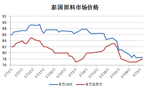 今日泰國(guó)原料表現(xiàn)堅(jiān)挺,停割期間原料價(jià)格抗跌。USS漲0.1銖至78.5銖,RSS3跌0.7銖至81.39銖,膠水漲1銖至78銖。中心市場(chǎng)到貨量不多,USS五大市場(chǎng)共成交483.1噸,RSS共成交163.2噸。目前南部已80%停割,產(chǎn)量只有正常的20%,膠農(nóng)庫(kù)存前期也多已出清,目前銷(xiāo)售壓力不大。預(yù)計(jì)南部將于4月初開(kāi)割。