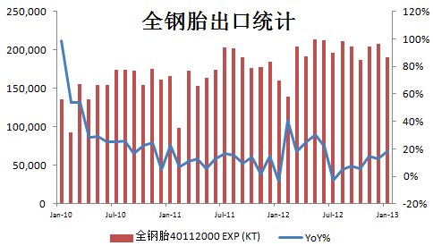 1月中國全鋼胎共計出口19.04萬噸,10、11、12月出口量分別為18.7萬噸、20.4萬噸、20.8萬噸,12年1月出口量為16.1萬噸。全鋼胎出口單價在過去的一年里持續下滑,累計下跌幅度為11.5%,1月份繼續較12月份下跌3美分/公斤至3.22美元/公斤。