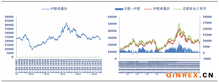 圖1: 滬膠主力收盤價 圖2: 日膠-滬膠價差