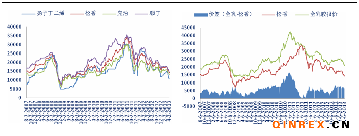 圖9: 合成膠市場報價 圖10: 松香-全乳膠價差