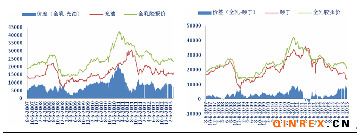 圖11:充油-全乳膠價差 圖12: 順丁-全乳膠價差