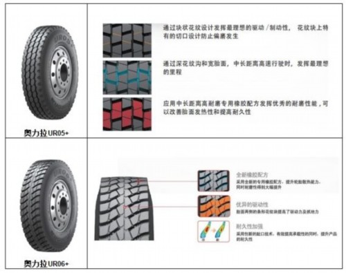 此外,為進一步協助運輸業降低運營成本和提高經濟效益,奧力拉品牌也開始陸續在國內推出升級產品。此次上市的奧力拉UR05+和UR06+是兩款適用于鋪裝路面及一般路面的翻斗車輪胎升級產品,通過采用全新高耐磨專用橡膠配方提升胎面散熱能力,耐磨性獲得大幅提升;同時其塊狀花紋設計實現了最佳的驅動性和制動性以保證行車安全。UR06+還特別采用了創新趾口技術,在有效提高承載性的同時,進一步提升產品的耐久性。