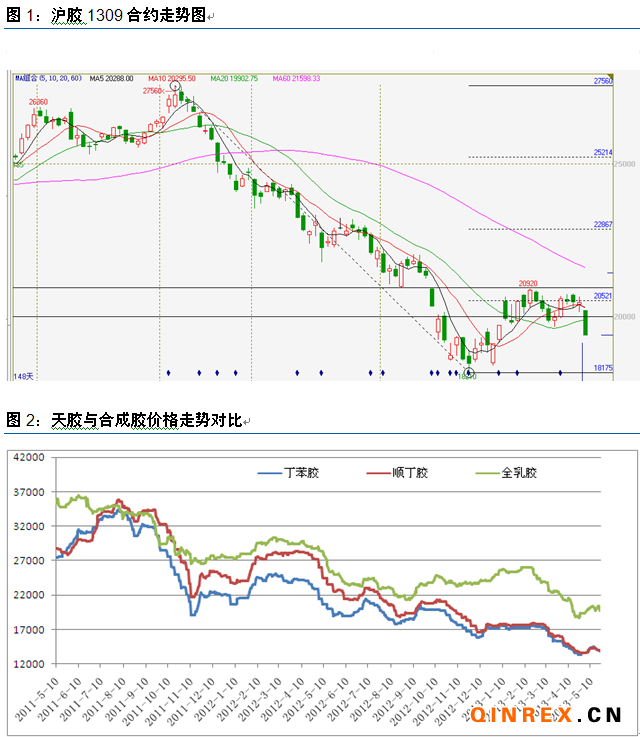 宏觀面,市場將伯南克的講話解讀成利空,而匯豐5月中國制造業PMI數據為49.8,低于預估的50.4。國內金融市場再次受到空襲,而滬膠更是借勢跌停封盤,主力1309合約報收長陰,收于19390點。我們認為與其說是此次宏觀面的消息利空滬膠,倒不如說是恰好為滬膠提供了等待將近半個月之久的最后一根稻草。膠市前期匯集的利空因素在不斷發酵中終于等到了發泄的敞口,于是震蕩僵持格局被打開,中線下行軌道有望重啟。操作上,近兩日評論中我們均已提示可逢高試空,后市建議空單繼續持有。
