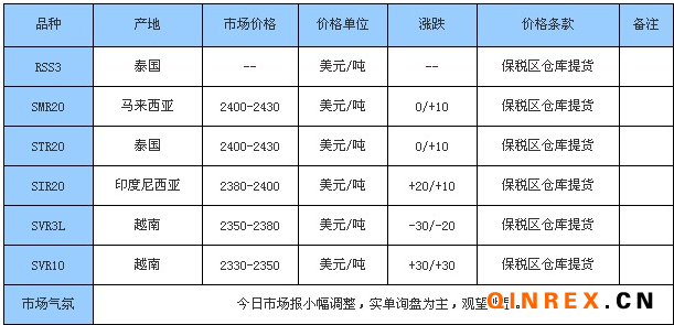 浙江地區天然橡膠市場,云南國營全乳膠市場報價在18800元/噸左右,海南國營全乳膠市場報價在18600元/噸左右,云南標二市場報價在17500元/噸左右,越南3l含13%稅在18500元/噸左右,含17%稅在18900元/噸左右,泰三煙片市場含17%稅在19000元/噸左右,貿易商出貨不多,下游即用即買,市場成交量有限。上海地區高順順丁橡膠市場觀望居多,少量大慶、高橋順丁報價在13400元/噸附近;報價僅供參考,市場氣氛清淡,實盤一單一談。
