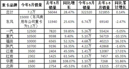 第一商用車網記者最新獲悉,今年5月份,重卡市場共約銷售各類車輛7.2萬輛,比去年同期的56044輛增長了28.47%,環比4月(81549輛)只下降了11.7%。受此鼓舞,除了北奔重汽之外的所有主流重卡企業,5月份同比增幅都是一片飄紅。這其中,東風、一汽、重汽、福田和陜汽繼續保持了萬輛級,當月分別銷售重卡1.5萬、1.25萬、1.05萬、1萬和1.07萬輛,同比增幅分別為25.63%、59.85%、9.40%、52.32%和16.35%;江淮、紅巖和華菱分別銷售重卡3500輛、2302輛和2680輛,同比增長幅度也是正數(45.59%、61.54%和108.07%),只有北奔出現下降,5月銷量約為1500輛,比去年同期的2754輛下降了45.53%。