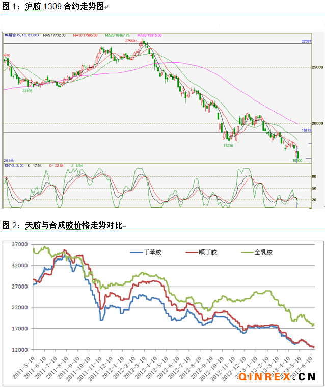 上周緣于QE退出預(yù)期的升溫以及國內(nèi)PMI數(shù)據(jù)的疲軟,國內(nèi)市場遭受到系統(tǒng)性風(fēng)險的空襲,而這也直接導(dǎo)致了正在醞釀弱勢反彈中的膠市再次陷入空軍的包圍,膠價跳水創(chuàng)新低17000點(diǎn)。今日國內(nèi)市場亦是普遍偏弱,股市更是哀鴻遍野,滬深300指數(shù)跌幅達(dá)6.31%。覆巢之下無完卵,滬膠1309合約盤中失守17000點(diǎn),收于16900點(diǎn)。
