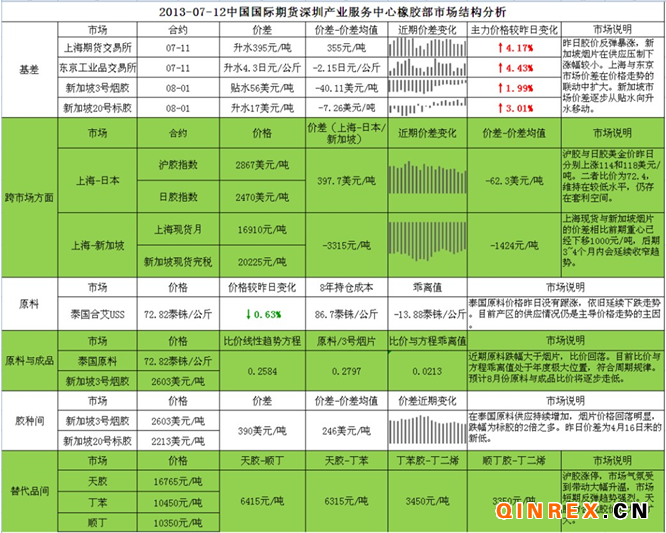 基差方面:受伯南克維持寬松表態(tài)刺激,美元下挫,滬膠漲停。但此輪反彈為宏觀刺激下的市場(chǎng)反應(yīng);后期膠價(jià)還是會(huì)回歸理性,長(zhǎng)期來(lái)看仍為偏空格局。上海和東京市場(chǎng)價(jià)差受價(jià)格走勢(shì)影響波動(dòng)較大,新加坡煙片近月將逐步轉(zhuǎn)弱,標(biāo)膠遠(yuǎn)月走強(qiáng),所以?xún)r(jià)差穩(wěn)步的由貼水向升水移動(dòng)。