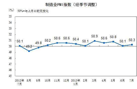 2013年7月,中國制造業采購經理指數(PMI)為50.3%,比上月微升0.2個百分點。