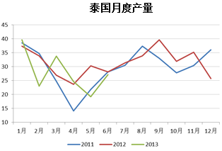 隨著近期天氣的穩定,泰國生產已趨穩定。預計2013年全年泰國天膠產量為386.4萬噸,較12年增加8.6萬噸或2.3%。而從中長期來看,05-08年間泰國大量種植和翻新的膠園將逐步進入開割期,產量也將穩步增加,預計2020年泰國天膠產量將繼續穩定增長,預計至2020年產量將增產至430萬噸以上。