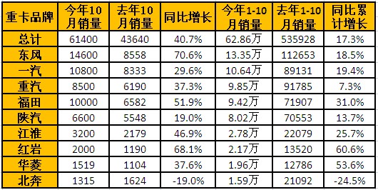 從各個廠家的情況來看,東風汽車公司還是一馬當先,以前十月銷售重卡13.35萬輛、同比增長18.5%繼續穩居全行業第一,一汽集團則以10.64萬輛和增幅19.4%跟隨其后;福田和重汽的差距越來越小,前者今年1-10月銷車9.42萬輛(增長31%),與第三名重汽(9.85萬輛)的銷量之差只有4000多輛;第五名陜汽累計銷售重卡8.02萬輛,同比增長13.7%;江淮以2.78萬輛和同比增幅25.7%穩居行業第六;紅巖和華菱星馬分別累計銷售2.17萬輛和1.96萬 輛,增幅繼續位列行業前兩甲(60.6%和53.6%);北奔由于企業內部調整以及消化庫存等原因,前十月銷售重卡只有1.59萬輛,同比下降 24.5%。