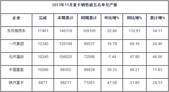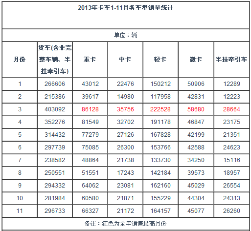 2013年卡車市場隨著全國港口、公路、城鎮(zhèn)建設(shè)等項(xiàng)目開展以及整體經(jīng)濟(jì)形勢上揚(yáng),貨車銷量穩(wěn)步增長。截止11月國內(nèi)貨車完成銷售296733,累計(jì)銷售3211783,累計(jì)增幅達(dá)到6.9%。