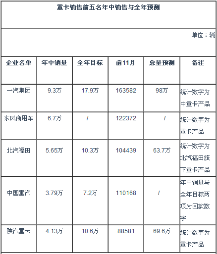 其中重卡:前11月售出694116輛,累計(jì)增幅18.41%;11月產(chǎn)70891、售66327輛。東風(fēng)商用車13991輛、一汽集團(tuán)12505輛、中國重汽10252輛、北汽福田10131輛、陜汽重卡8801輛分列前五名。